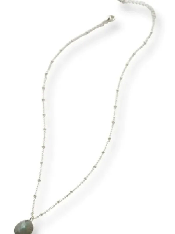 Fasettihiottu pisaran muotoinen riipus labradoriitti jalokivellä. Labradoriitti symboloi menestystä, intuitiota ja itsetutkiskelua.