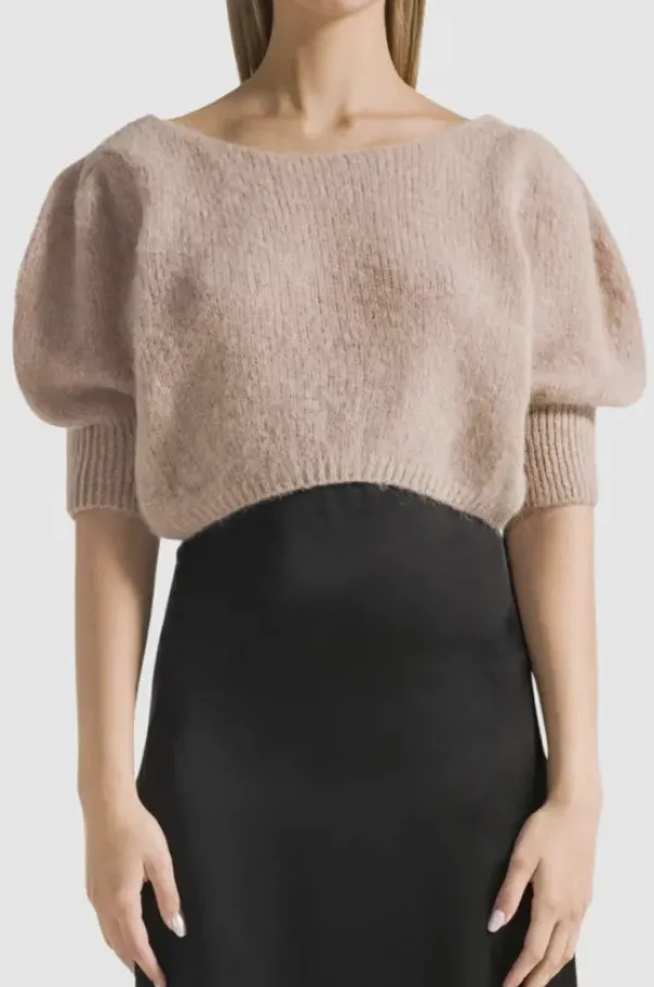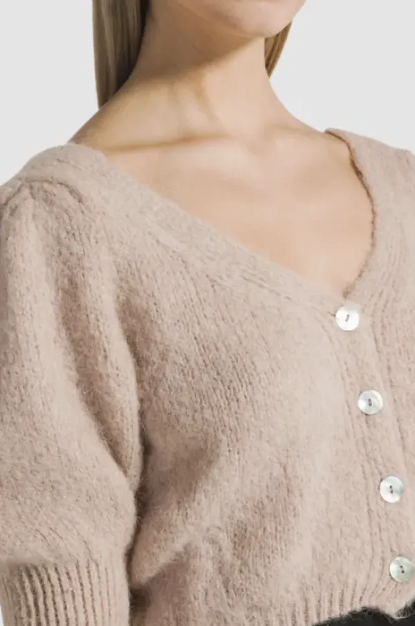 Americandreamsin kaunis lyhyt neuletakki lyhyillä puhvihihoilla. Pehmoinen alpakka tuntuu kivalta iholla. Voit pukea neuletakin myös puseroksi napit selkäpuolelle.