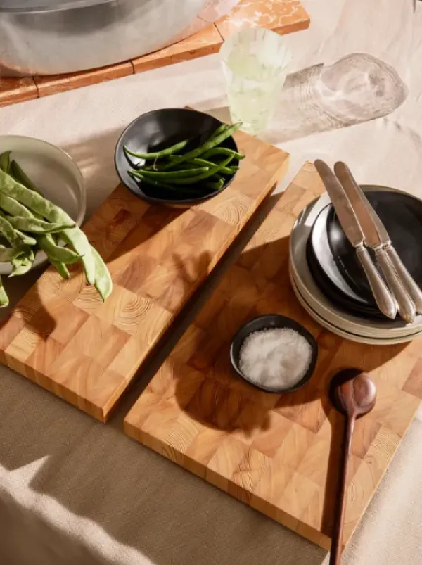 Leikkuulaudat on valmistettu FSC™-sertifioidusta lehtikuusesta. Neliökuvio ja pienet jalat antavat ilmettä näille alustoille, jotka ovat kivoja myös kattauksessa. Pinta on öljytty.