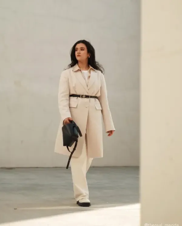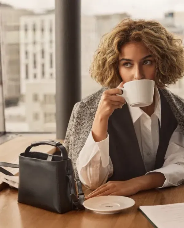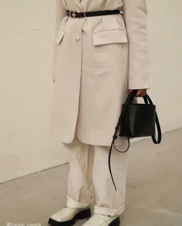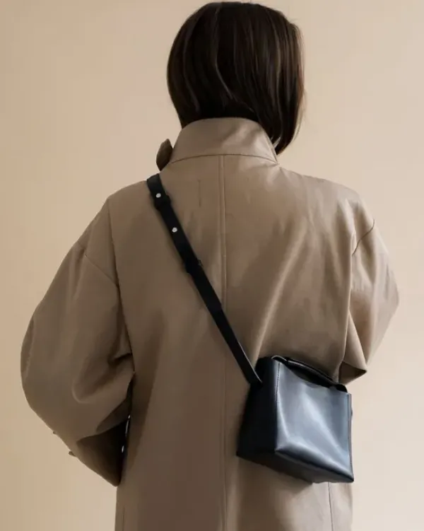 Käsilaukussa on sekä lyhyt että pitkä säädettävä musta nahkahihna. Sisällä pienempi nahkasta tehty sisätasku. Käsilaukun voi sulkea helpon magneettinapin avulla.