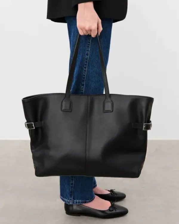 Flatteredin suureen suosioon noussut Lesley tote bag nyt mustassa nahassa. Laukussa on runsaasti tilaa tärkeillä tavaroille.