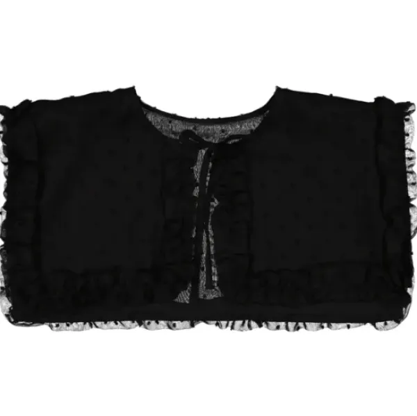 Kotimaisen Gauhar Helsingin neliönmuotoinen kaulus, jossa röyhelöyksityiskohdat, leikkisät pilkut ja rusettikiinnitys.