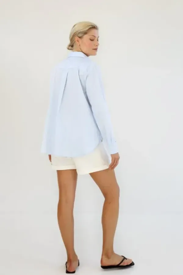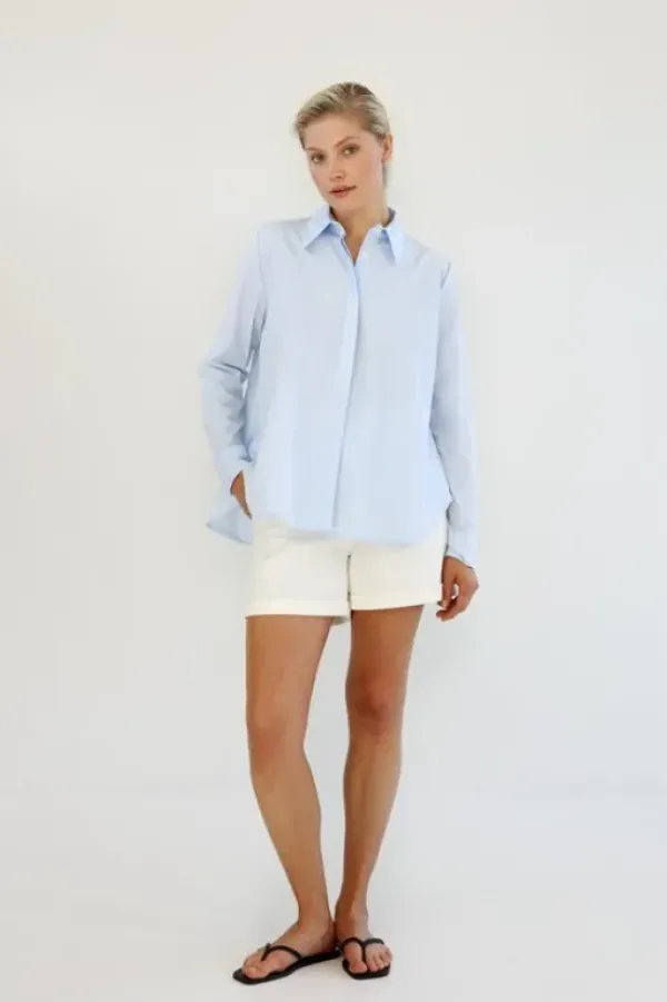 Gauhar Helsingin suosittu puuvillapaitapusero nyt uudessa vaaleasinisen sävyssä! Tässä klassisessa mallissa on pitkät hihat, piilonappikiinnitys ja hieman pidempi helma takana. Suunniteltu jokapäiväiseen käyttöön, sopii täydellisesti farkkujen, housujen tai suosikkihameesi kanssa.