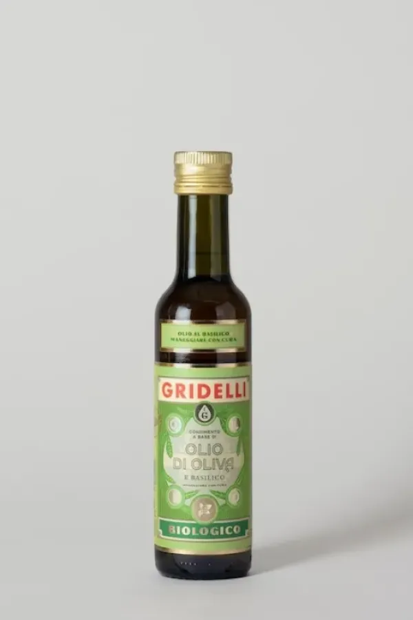 Gridellin ihana oliiviöljy, jossa ripaus basilikaa tuomassa makua. Öljy on valmistettu Calabrian oliiveista. Sopii täydellisesti pöytään mausteeksi. Kokeile pastojen, salaattien ja kalaruokien kanssa!