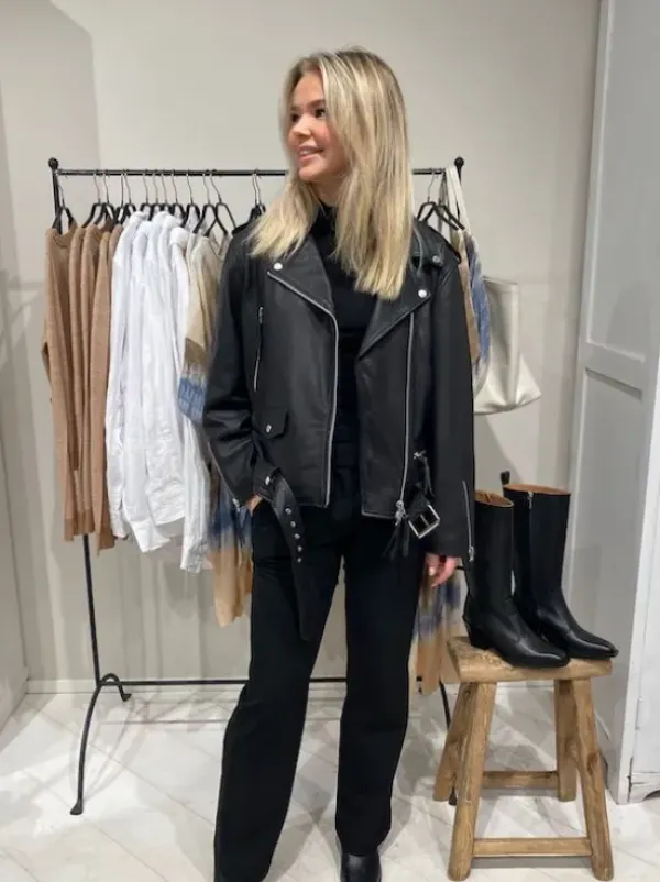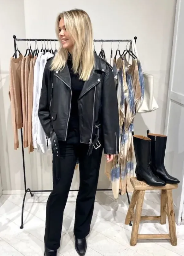 Tämä biker takki on normimitoituksella, mutta rento malli. Superpehmeää nahkaa ja musta satiinivuori! We love it! <3