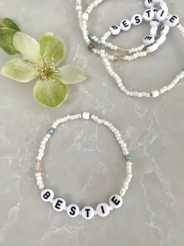 Käsityönä tehty rannekoru BESTIE parhaalle ystävälle ystävänpäivään – tai ihan mihin tahansa muuhun päivään. Koska bestiet ovat bestejä <3