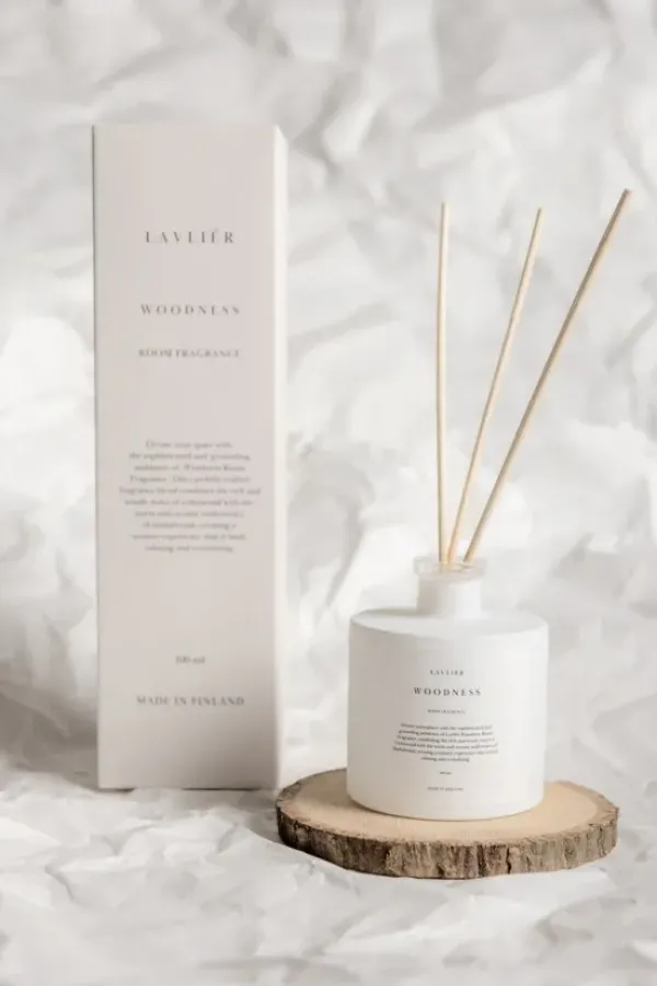 Laadukkaista tuoksuöljyistä valmistettu Lavliér Woodness-huonetuoksu muuttaa tilan rentoutumisen paratiisiksi.
