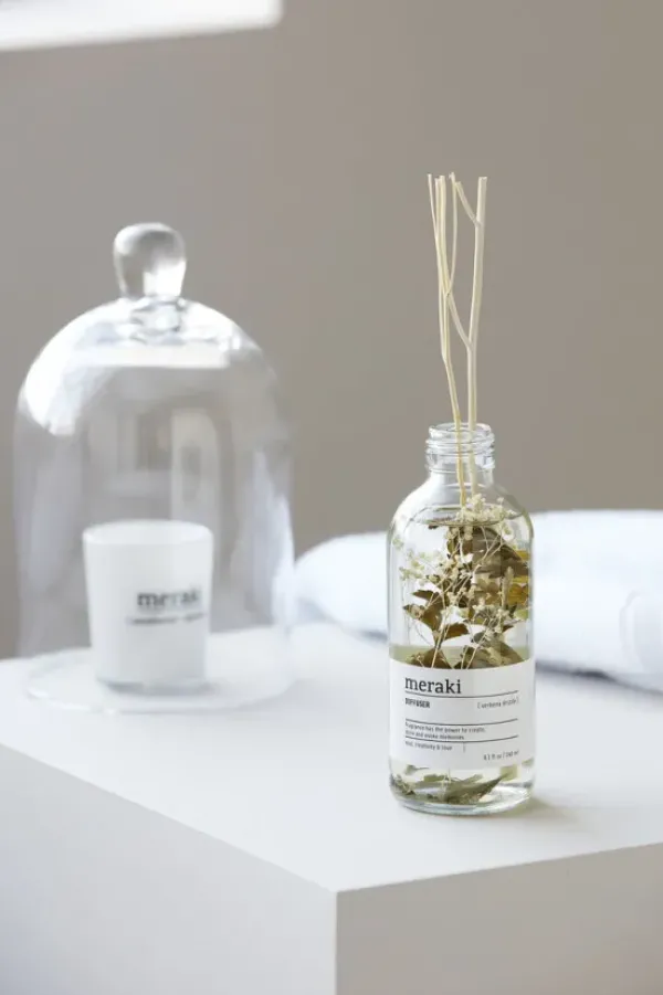 Tanskalaisen Merakin huonetuoksu, jossa tuoksuna hieno Verbena Drizzle. Tämä kaunis lasipullo oksineen tuo harmonista kauneutta niin kylpyhuoneeseen kuin muualle kotiin.