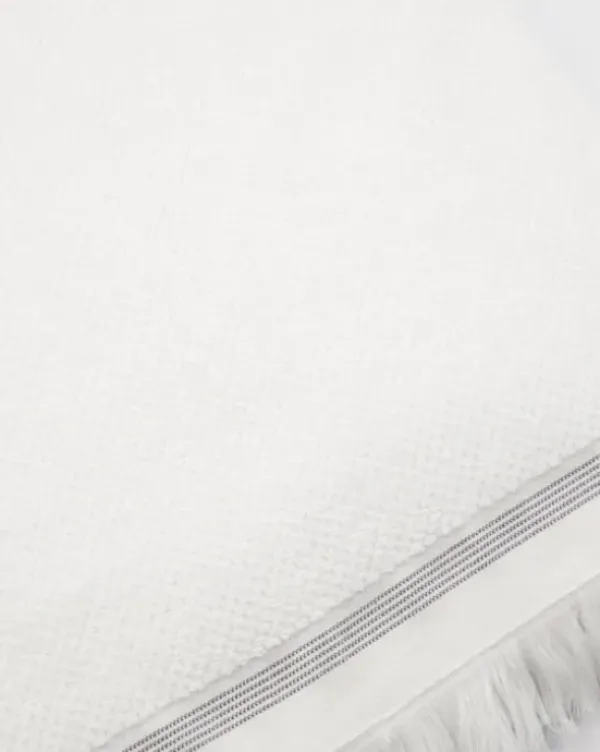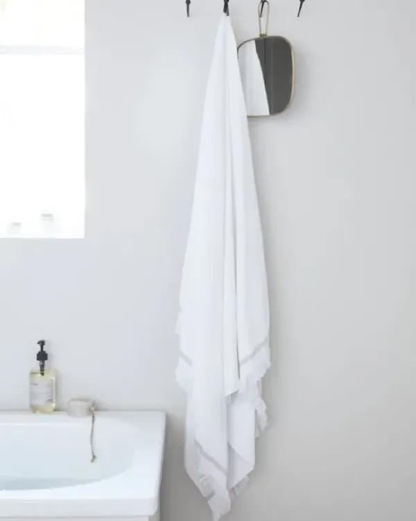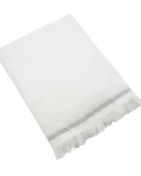 Merakin kaunis kylpypyyhe valkoisena, jossa pieni harmaa raita ja hapsut. Mahtava koko, tunnetaan myös nimellä kylpylakana, 100x180cm! Nämä pyyhkeet ovat ihanan pehmeitä, 100% luomupuuvillaa!