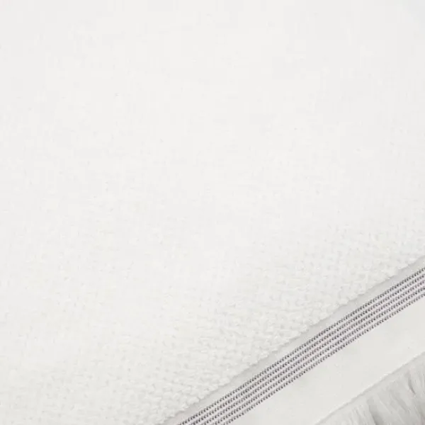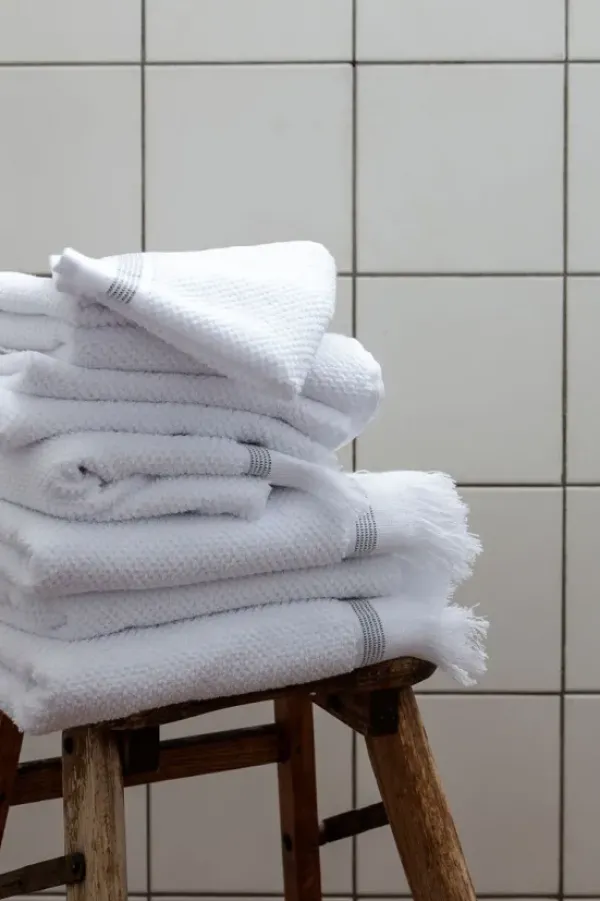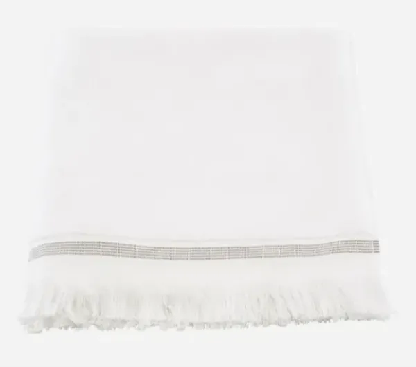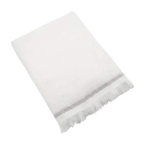 Merakin kaunis kylpypyyhe valkoisena, jossa pieni harmaa raita ja hapsut. Koko 70x140cm. Nämä pyyhkeet ovat ihanan pehmeitä, 100% luomupuuvillaa!