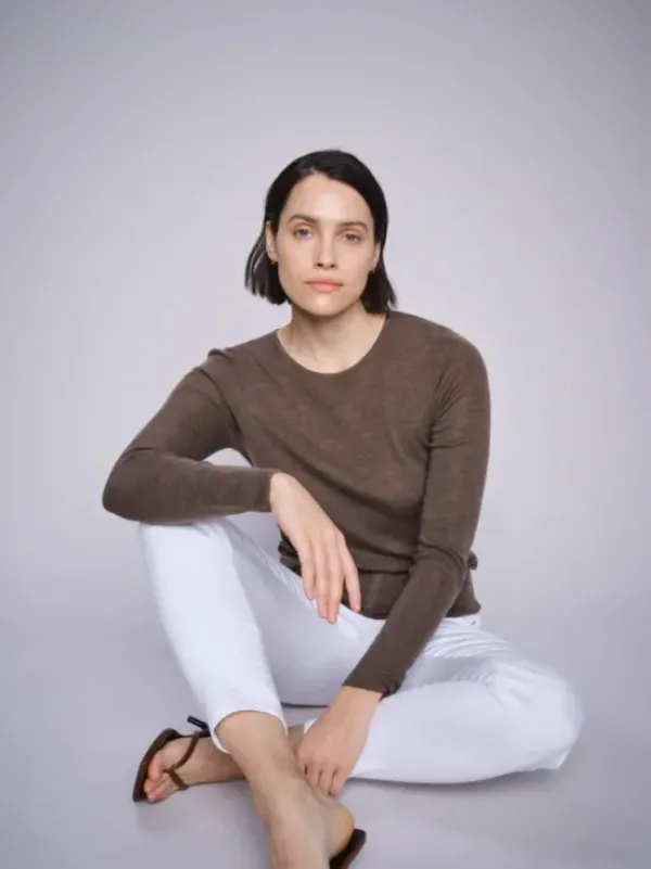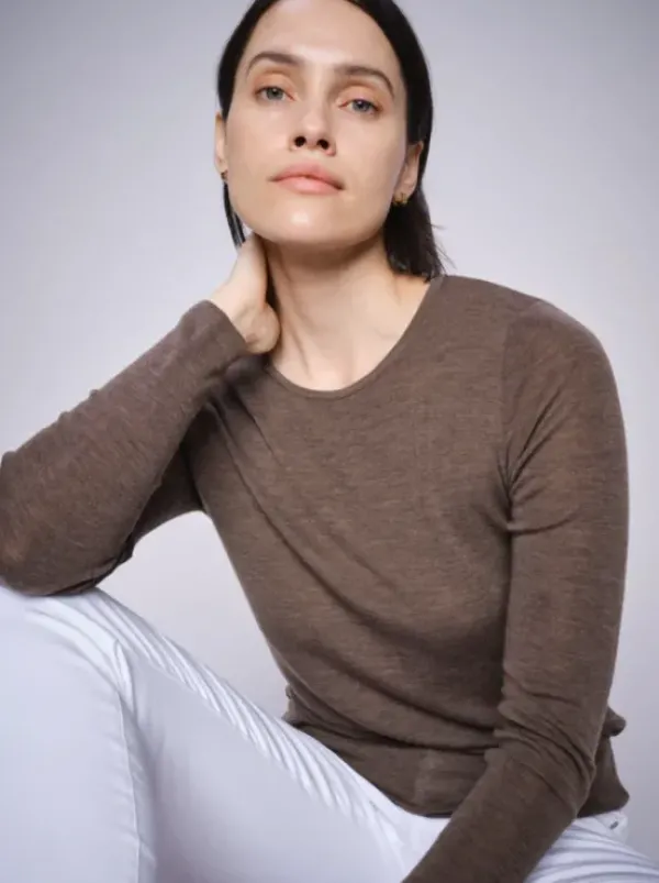 Mos Moshin ajaton pitkähihainen trikoopaita kierrätysvillasta. Ihana paita bleiserin alle tai sellaisenaan farkkujen kanssa. Kaunis suklaanruskea sävy. Neuleessa kiva ribbikuviointi.