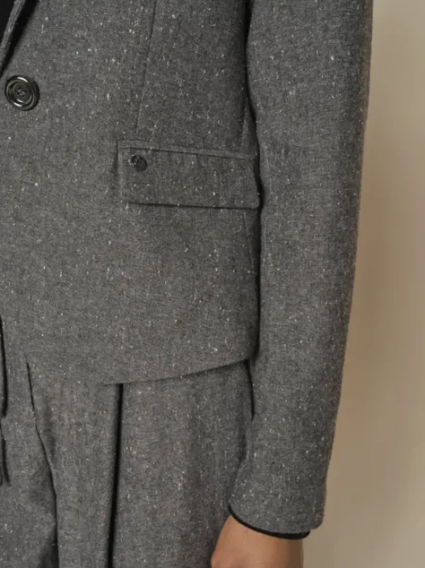 Näyttävä bleiseri kivan eläväisellä pinnalla. Kiinnitys yhdellä napilla. Yhdistä saman sarjan housujen ja korkkareiden kanssa tai rentoile bleiserissä hupparin ja hupparihousujen kanssa.