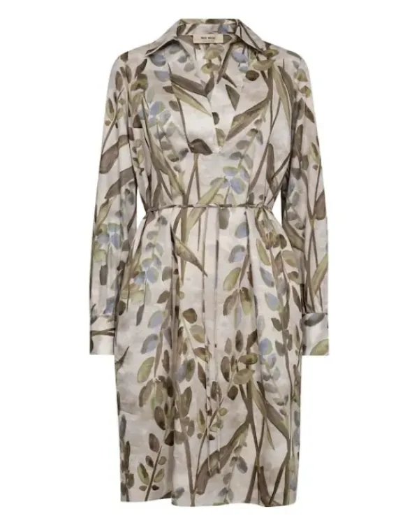 Mos Moshin puuvillainen mekko paitiskauluksilla. Avoin kaulus ja mukana kapea vyö, jolla voit halutessasi korostaa vyötäröä. Kokeile myös leveämmän nahkavuön kanssa.
