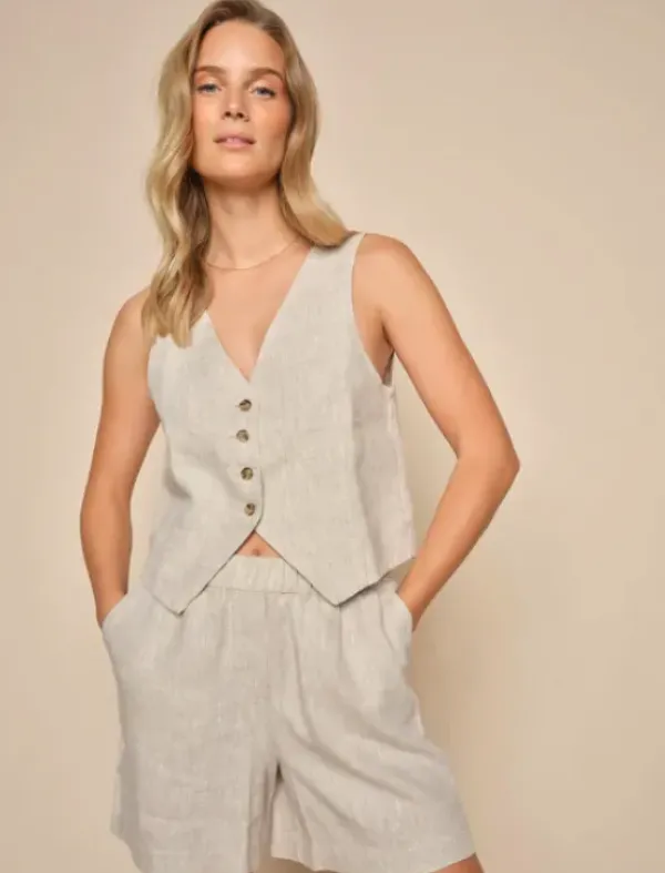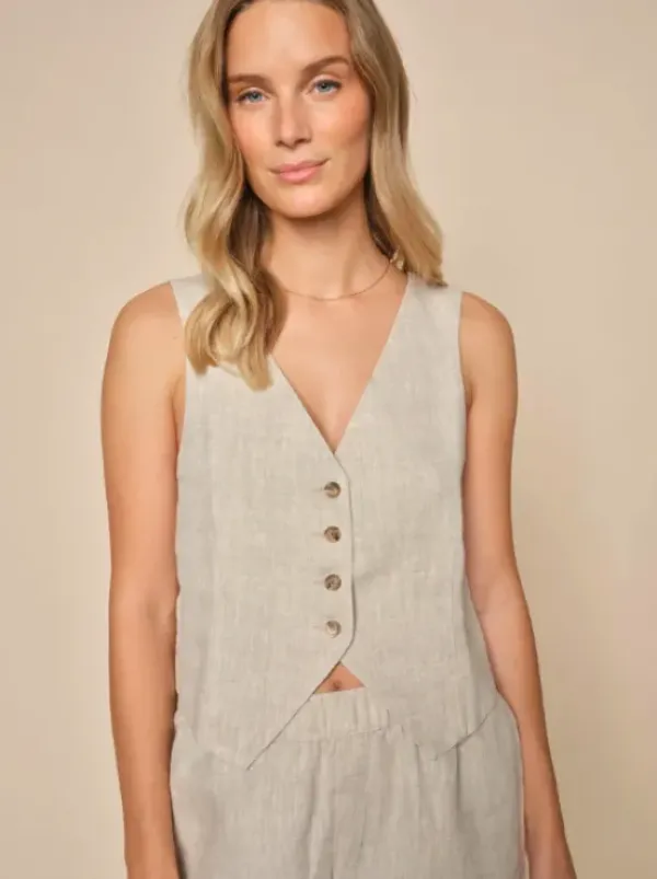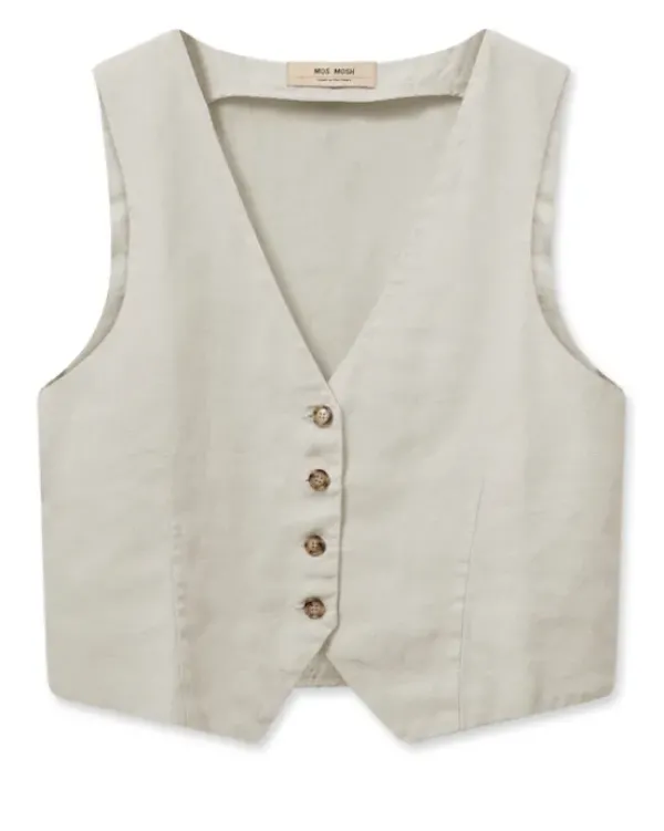 Mos Moshin kaunis pellavaliivi v-kaula-aukolla. Edessä napitus. Tämä liivi on helppo yhdistää monenlaisen alaosan kanssa. Täydellisen pellavalookin saat yhdistämällä sen rentojen pellavahousujen kanssa!