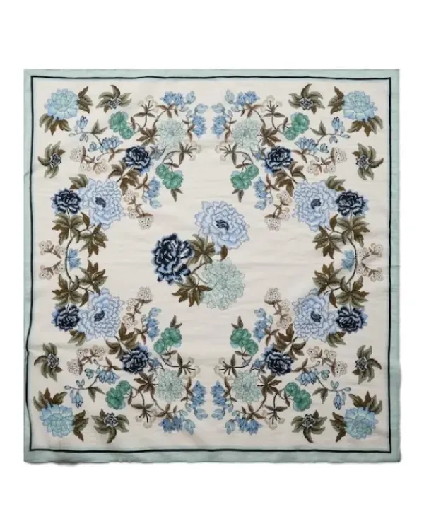 Mos Moshin kaunis, keväinen huivi ihanalla kukkakuosilla. Raikas sinisen sävy luonnonvalkoisella pohjalla.