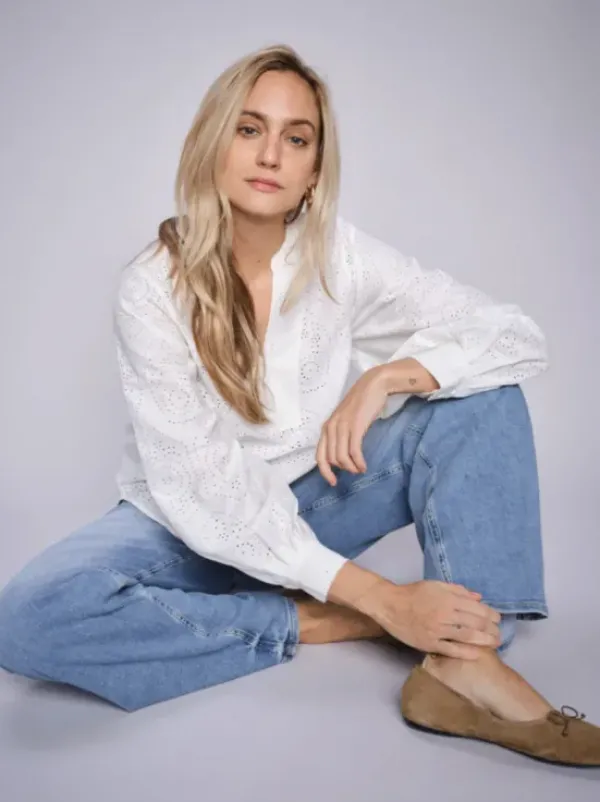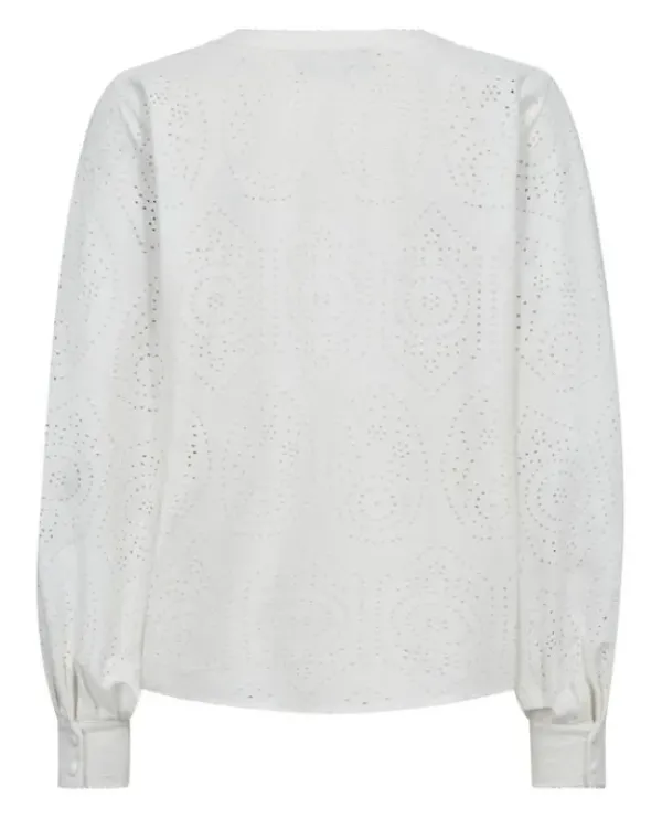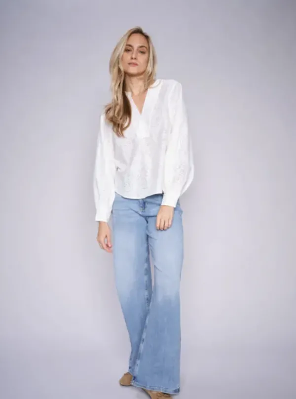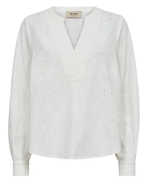 Mos Moshin naisellinen pusero, jossa kiva graafinen pitsikuvio. Kivasti laskeutuvaa puuvillasekoitetta. Kauniit puhvihihat ja v-kaula-aukko tuovat ilmettä. Rento malli.