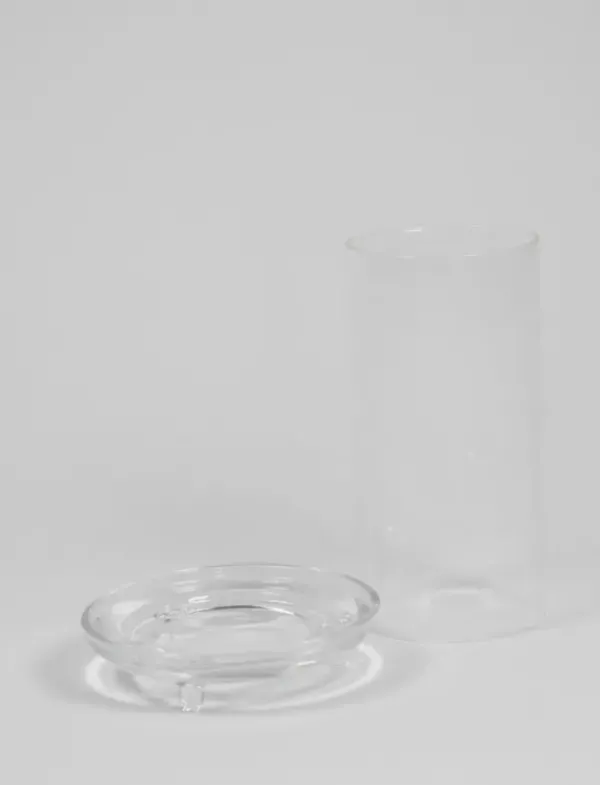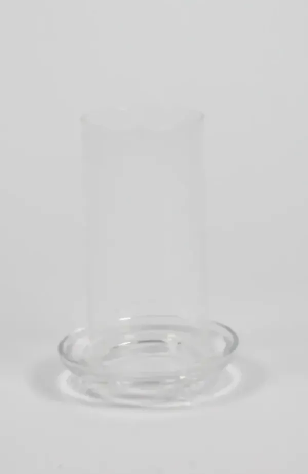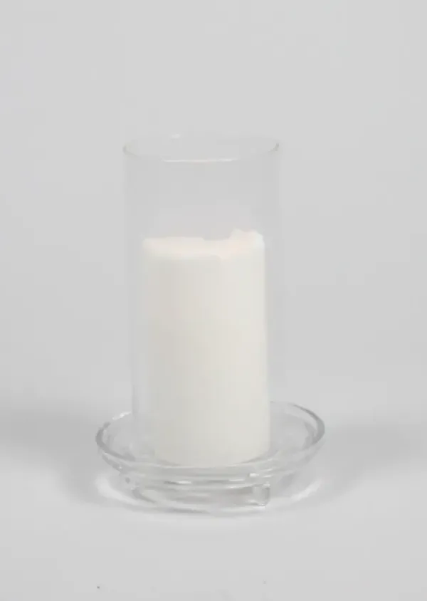 Ajaton lasinen kynttilänjalka pöytäkynttilälle tai tuikulle. Kynttilän suojana sylinterin mallinen nostettava kupu. Kaunis yksinään tai ryhmänä…