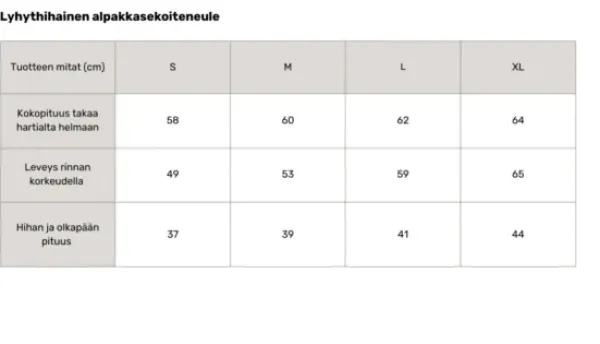 Materiaalina alpakkasekoite. Luethan neuleen hoito-ohjeet huolellisesti. Näin saat nauttia neuleestasi pitkään!