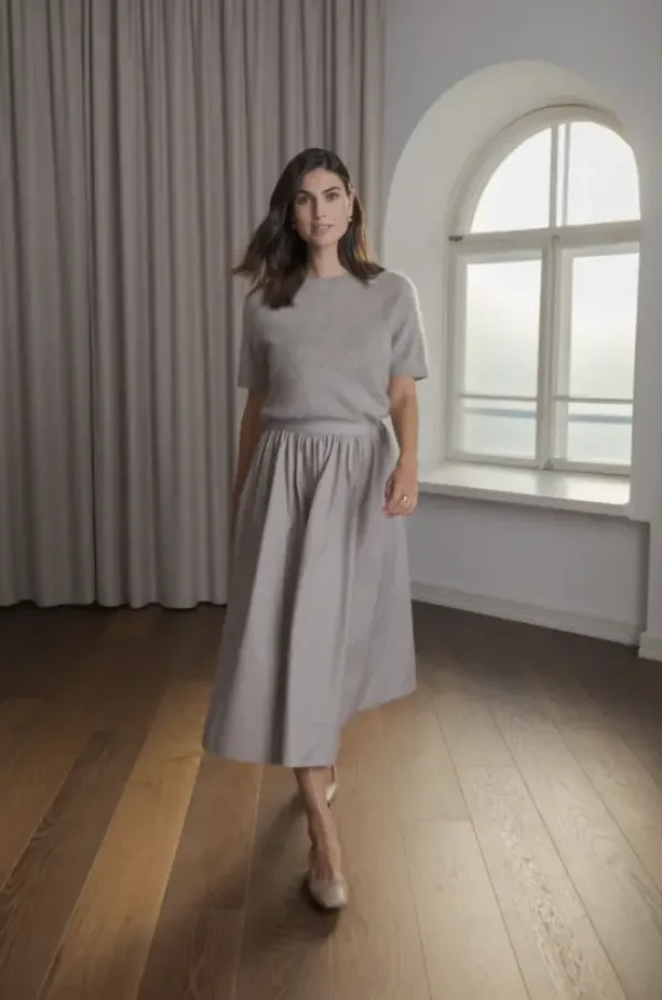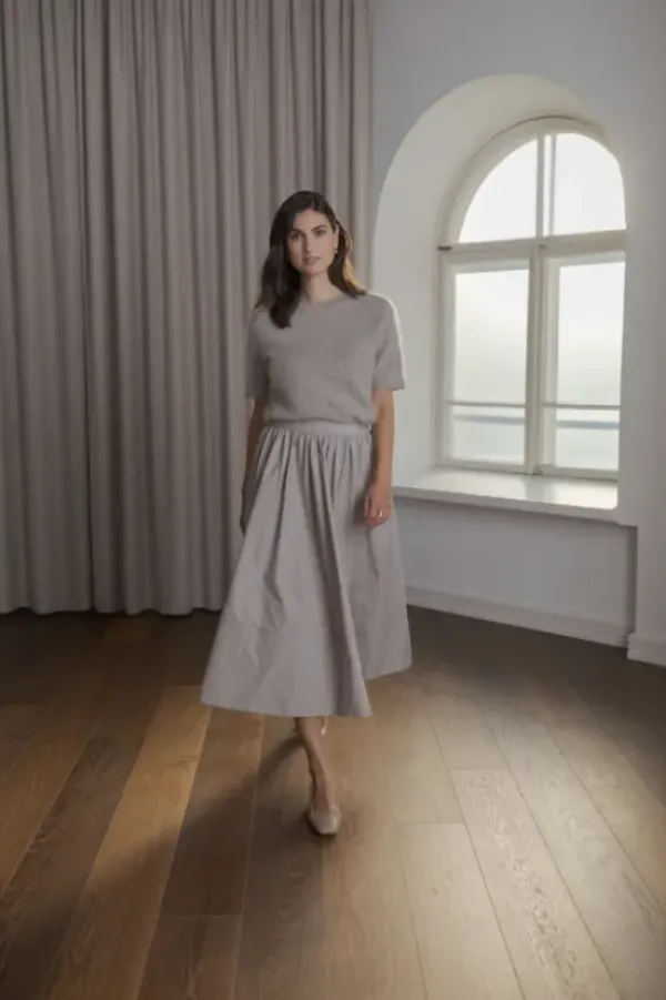 Kellomainen puuvillahame, jossa leveä käänne hameen helmassa. Vyötärönauhassa on kauniit laskostukset edessä ja takana. Vyötäronauhassa on kuminauha takana. Hame on valmistettu orgaanisesta puuvillasta, jossa on elastaania mukana lisäämässä käyttömukavuutta. Kankaan pinta on viimeistelty mattapintaiseksi.