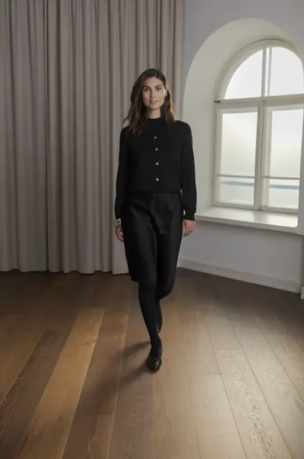 Japanilaisesta triasetaatti-muuntokuidusta valmistettu polvipituinen satiinihame. Kapealinjainen malli, jossa on piilotettu joustovyötärö. Helppohoitoinen materiaali säilyttää muotonsa ja tuntuu pehmeältä.