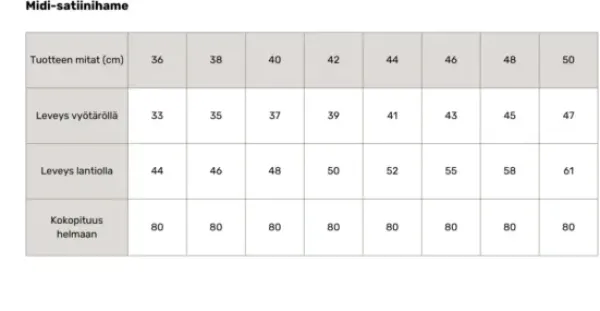 Kapealinjainen satiinihame midi-pituudella tarjoaa tyylikkään ja eleettömän ilmeen. Vyötärönauhan sisäpuolelle piilotettu kuminauha lisää käyttömukavuutta säilyttäen samalla hameen huolitellun ulkonäön.