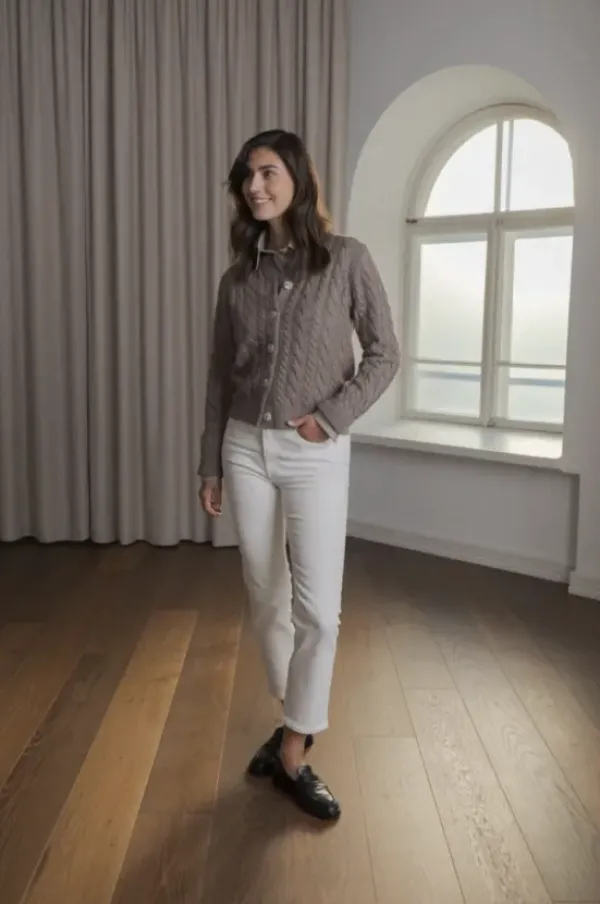 Klassisen tyylikäs palmikkoneuletakki on valmistettu laadukkaasta villa-cashmeresekoitteesta, jossa on 70 prosenttia villaa ja 30 prosenttia cashmerea. Edessä kulkeva kaunis, aaltoileva palmikkokuvio ja nappilista antavat neuletakille viimeistellyn ilmeen.