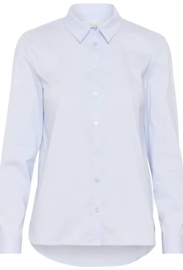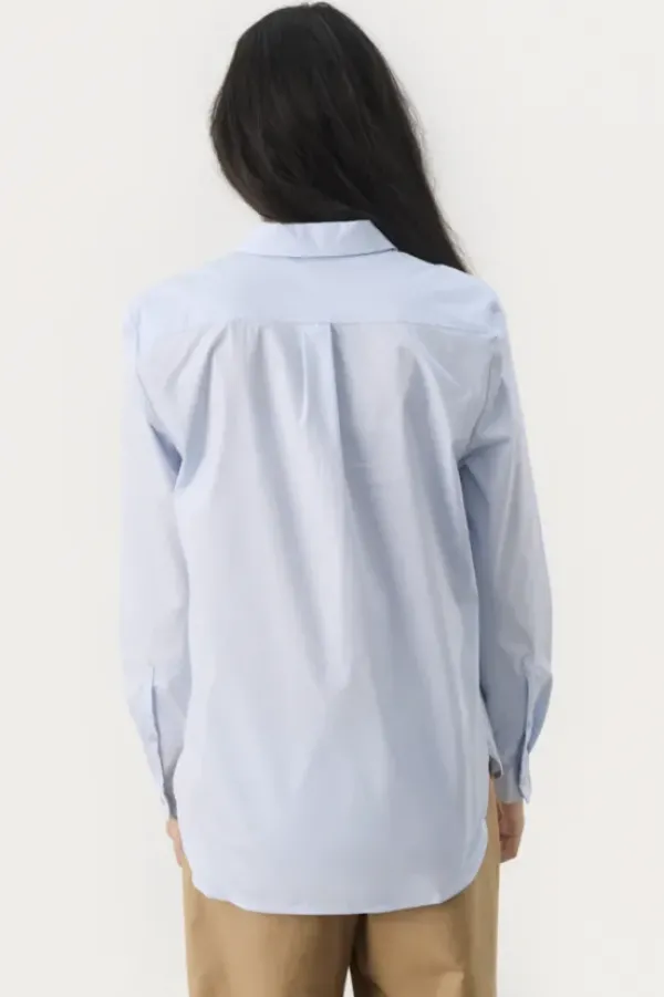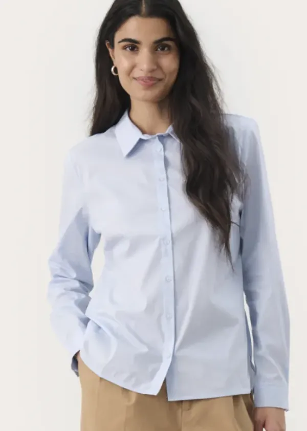 Part Twon kaunis, klassinen paitapusero, jossa selkäpuolella istuvuutta lisäävä laskos. Pitkät hihat. Puuvillasekoitetta. Nyt raikas uusi vaaleansinisen sävy heather.