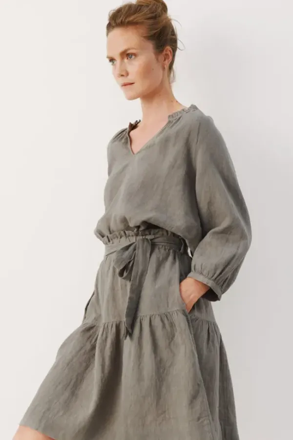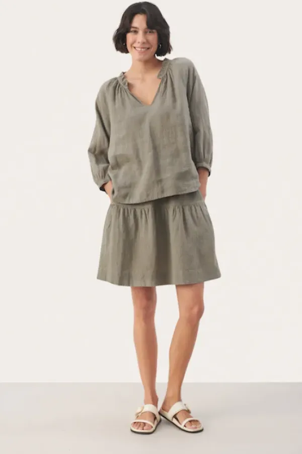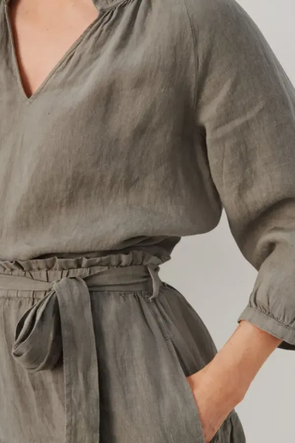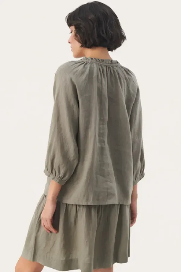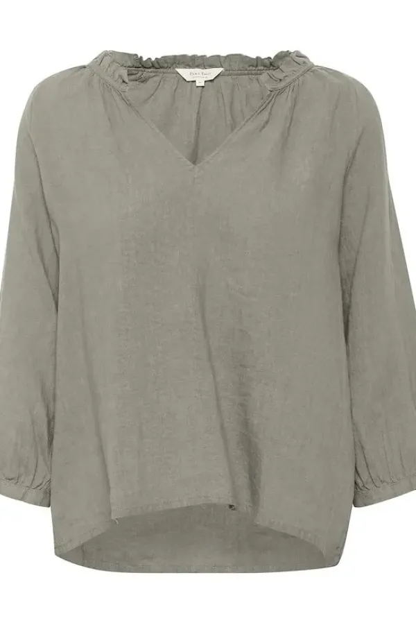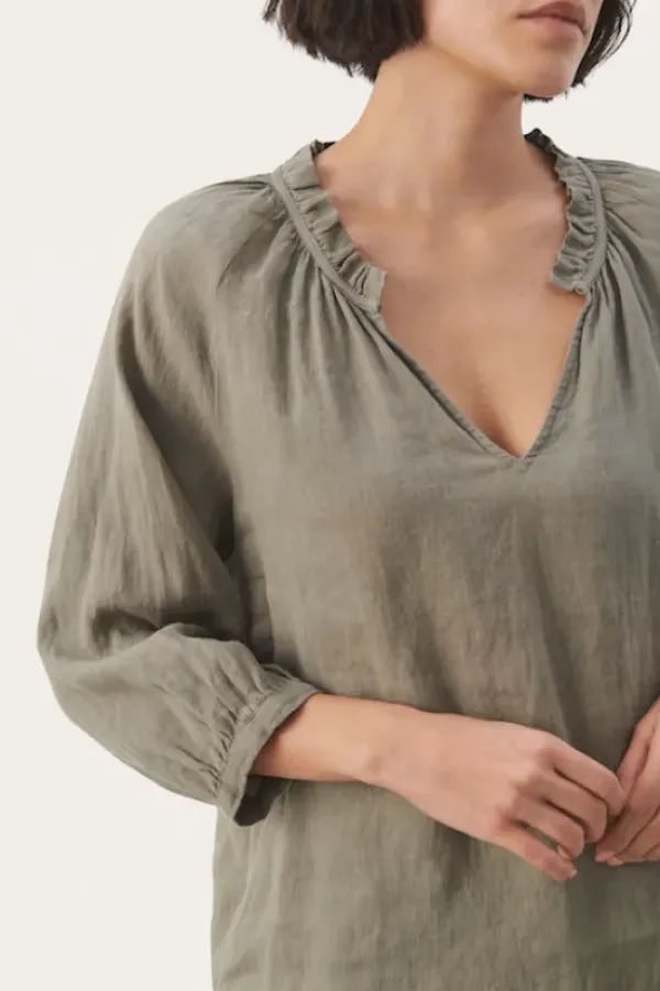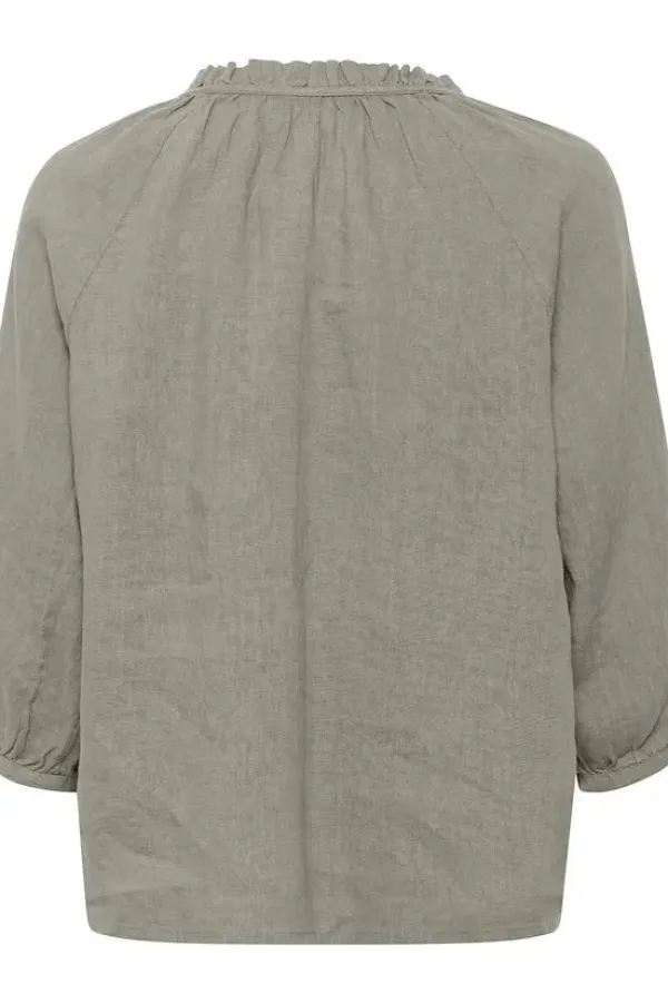 Kaunis pellavainen paita rennolla leikkauksella. Vajaamittaiset hihat, joissa kiva rypytys hihansuissa. V-kaula-aukko, johon yhdistetty kiva frillakaulus.