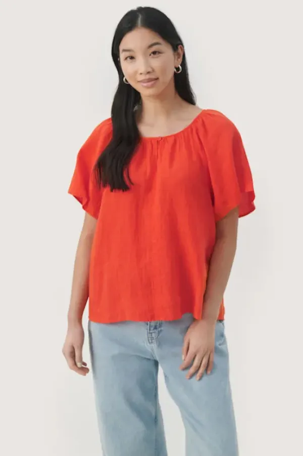 Part Twon kaunis pellavapaita kesään. Rento malli, jossa lyhyet hihat ja edessä kauluksessa nappi. Tämä on helppo yhdistää farkkujen, shortsien tai kesäisen hameen kanssa.
