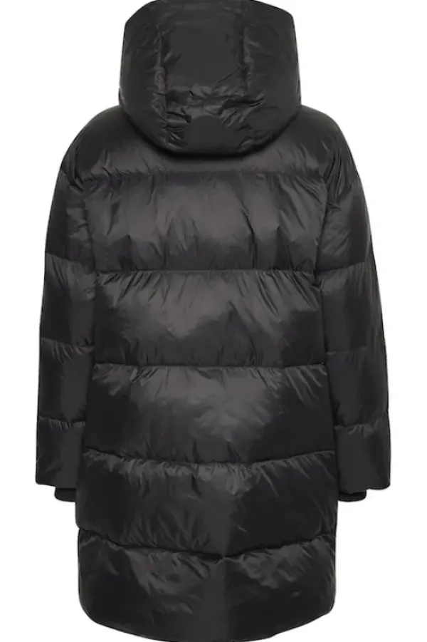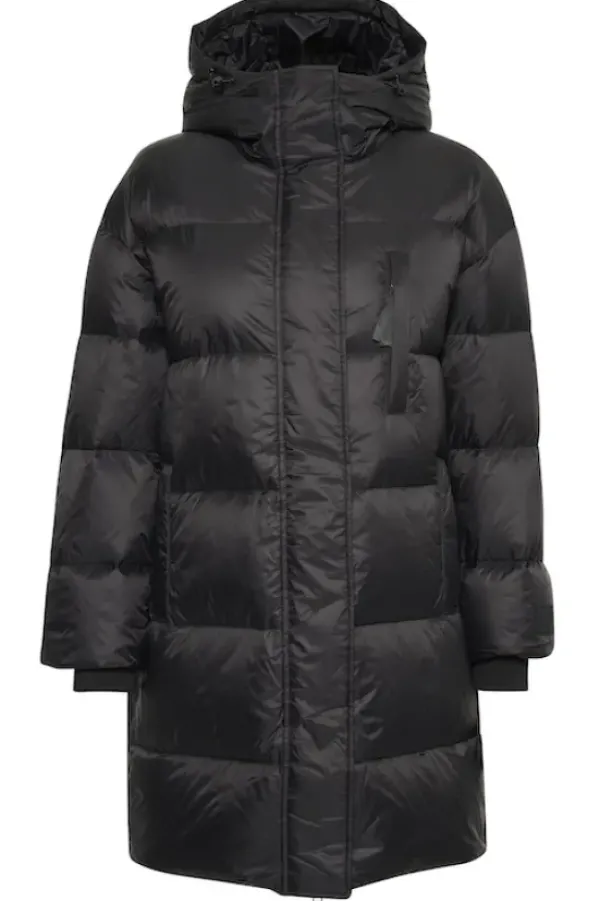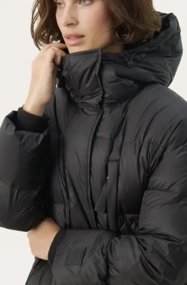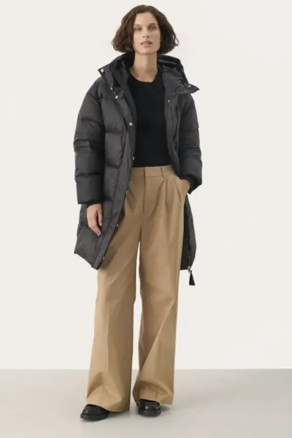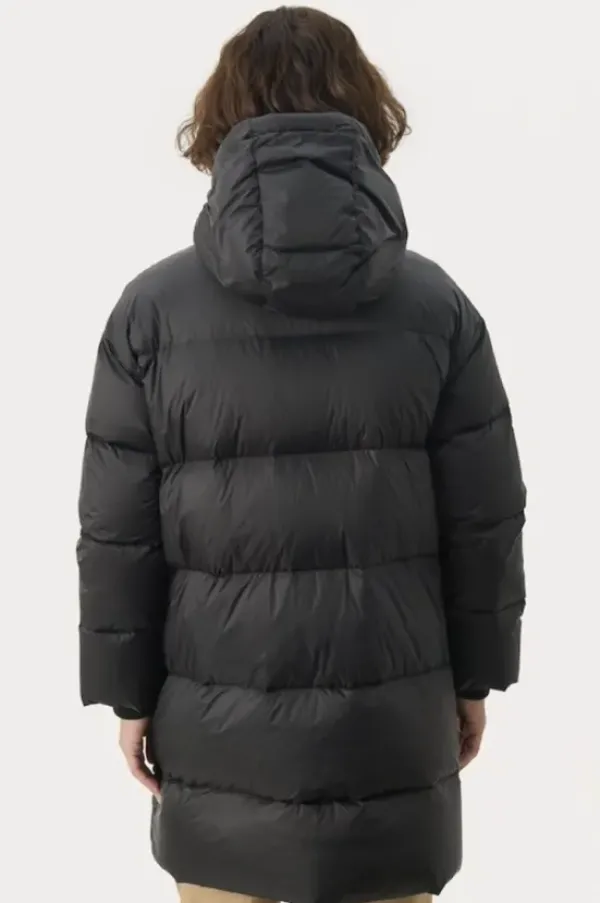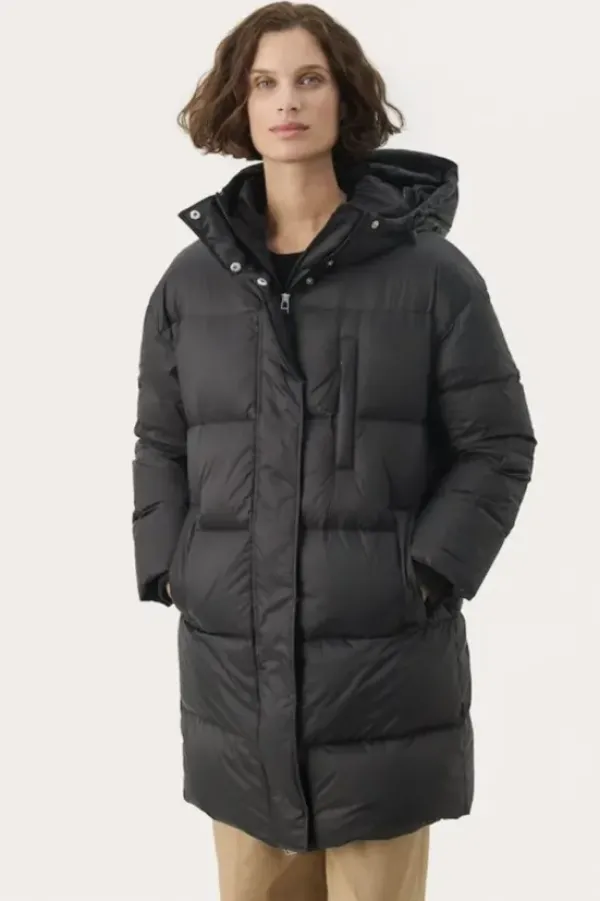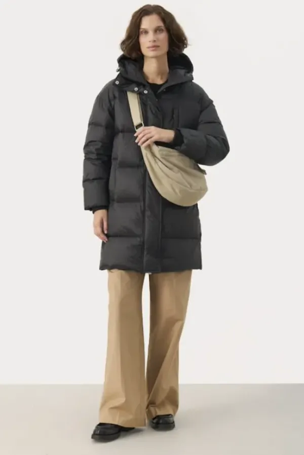 Part Twon rento untuvatakki, joka on juuri sopivan mittainen. Korkea kaulus, huppu, tilavat taskut ja resorit hihansuissa tekevät tästä täydellisenä viileisiin talvikeleihin. Pituus polven yläpuolelle. Tämä takki on mukava päällä ja siinä on helppo liikkua sekä kaupungilla että ulkoillessa.