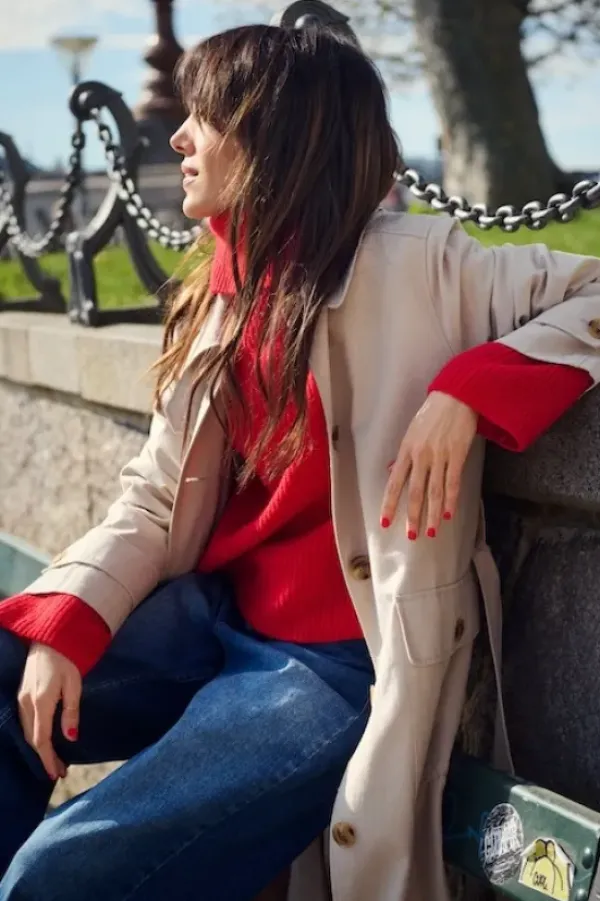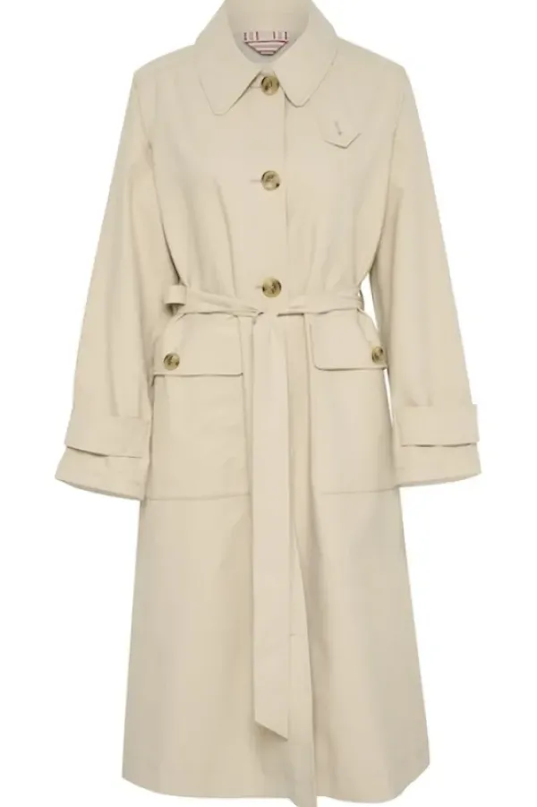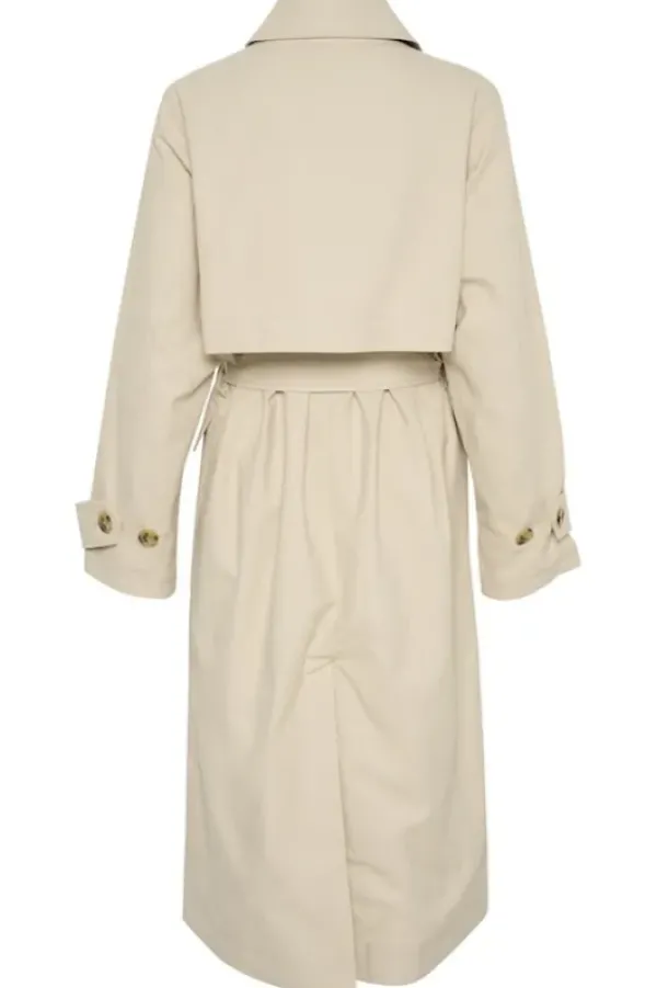 Part Twon klassinen trenssi kauniissa hiekan sävyssä. Pue kevättalveen neuleen päälle. Takana halkio, hihansuissa trenssille tyypilliset napilliset tampit. Vyöllä tuot linjakkuutta asuun.
