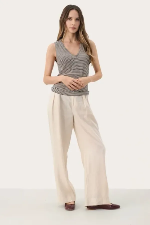 Part Twon kevään uutta: klassinen raitatoppi v-kaula-aukolla. Miellyttävää ribbineulosta. Käytä neuleiden tai bleisereiden alla tai kesällä sellaisenaan.