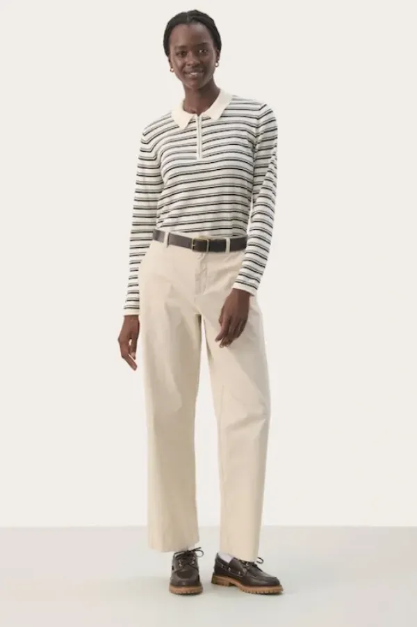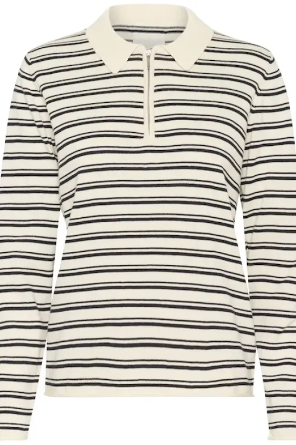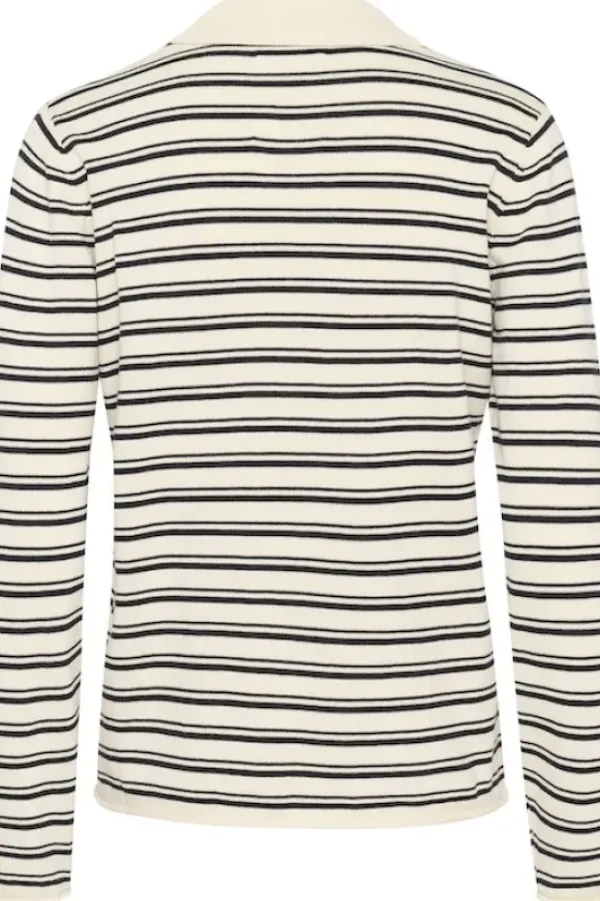 Part Twon keväinen raitaneule, jossa paitiskaulukset ja edessä yläosassa vetoketju. Kiva neule housujen tai hameen kanssa.