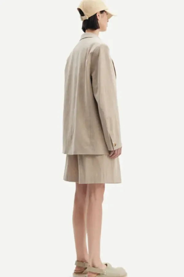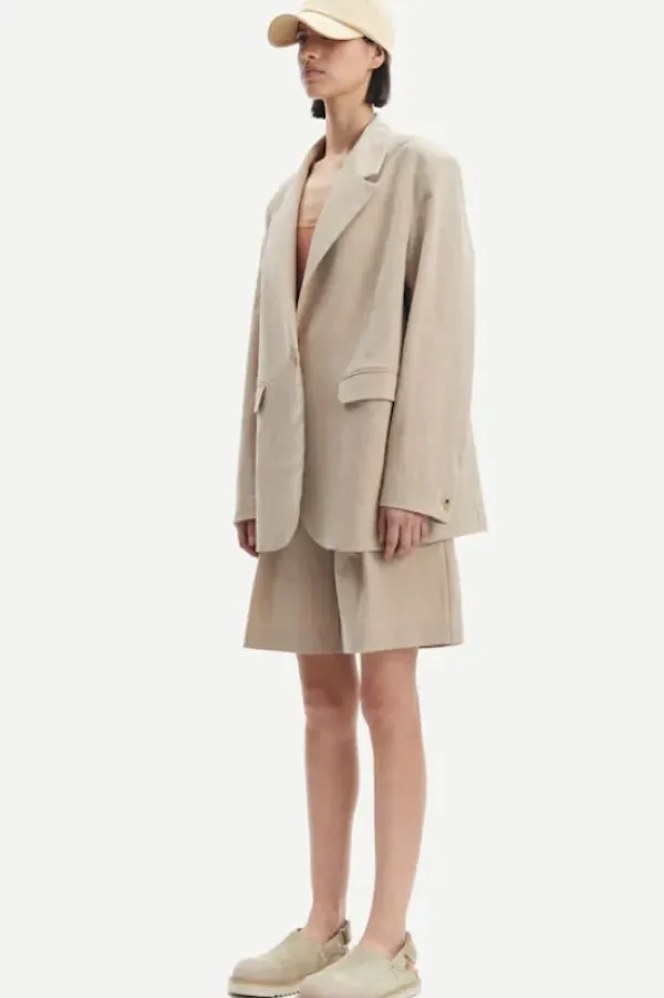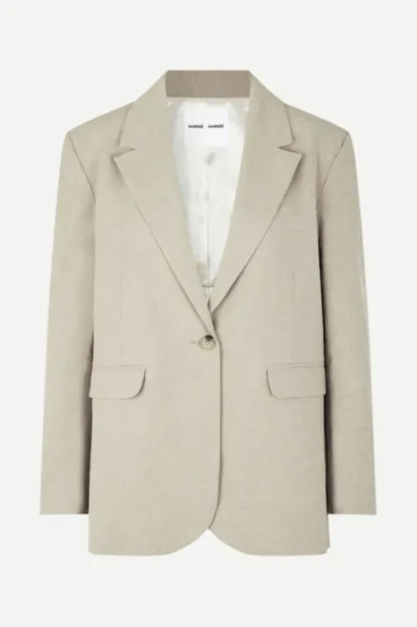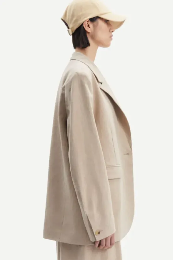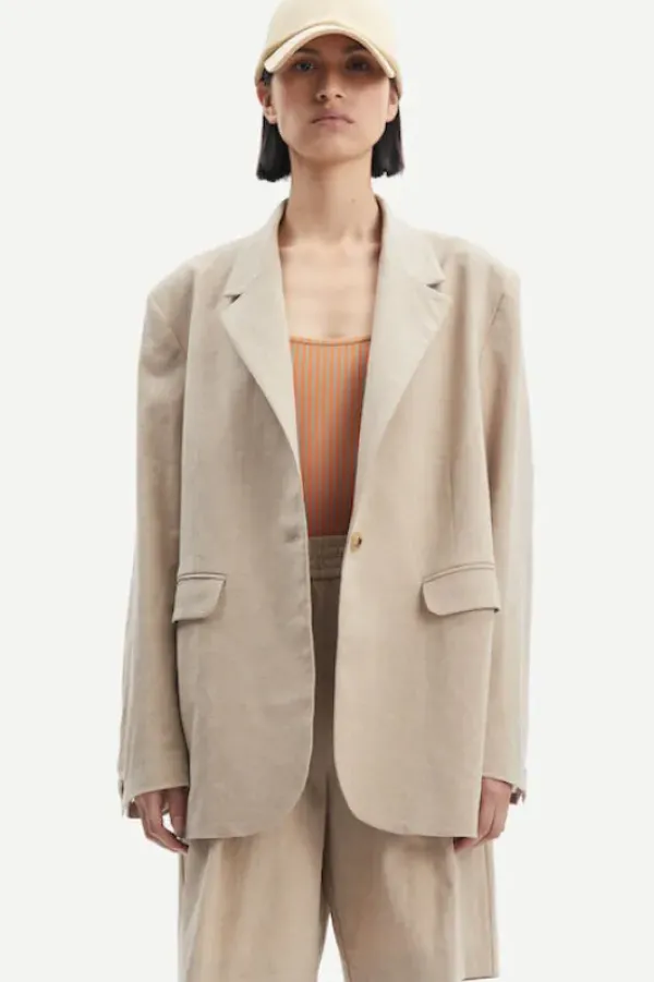 Samsoe&Samsoen rento bleiseri yhdellä napilla. Nyt niin trendikäs oversize malli miesten puvuntakin tyyliin… Etutaskut ja sisätasku. Kevyet olkatoppaukset. Materiaalina hivenen joustava pellavasekoite. Yhdistä saman sarjan Julia housujen tai vaikkapa farkkujen kanssa.