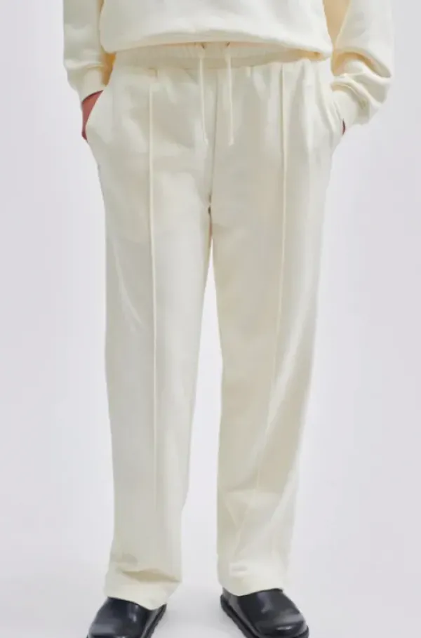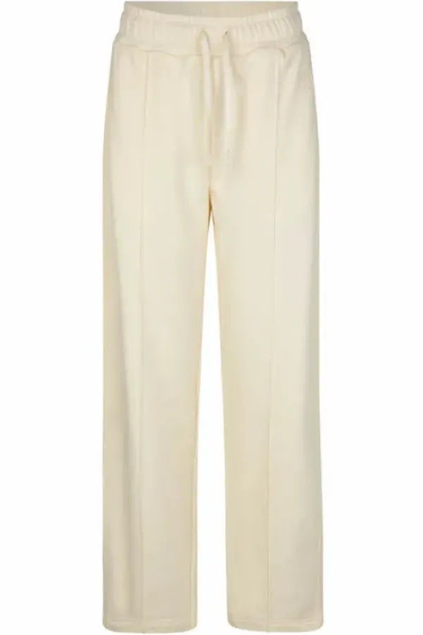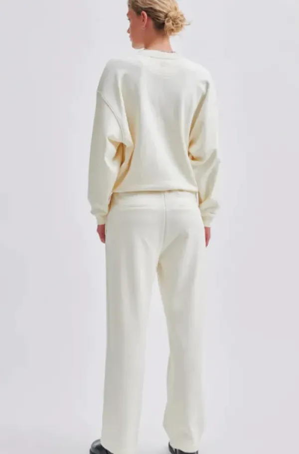 Second Femalen rennot collegehousut suorilla lahkeilla. Vyötäröllä kuminauha ja kiristysnyöri. Edessä ommellut koristeprässit. Sivusaumoissa taskut, takana koristetaskut.