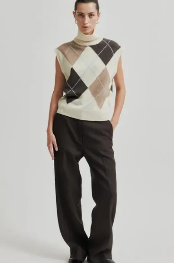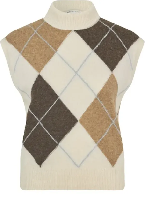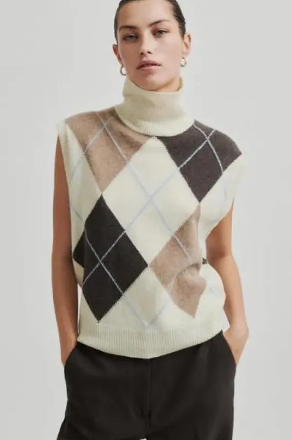 Second Femalen kaunis neuleliivi klassisella salmiakkiruutukuviolla. Poolokaulus. Pidä sellaisenaan hameen tai housujen kanssa tai pue bleiserin alle. Materiaalina villa.