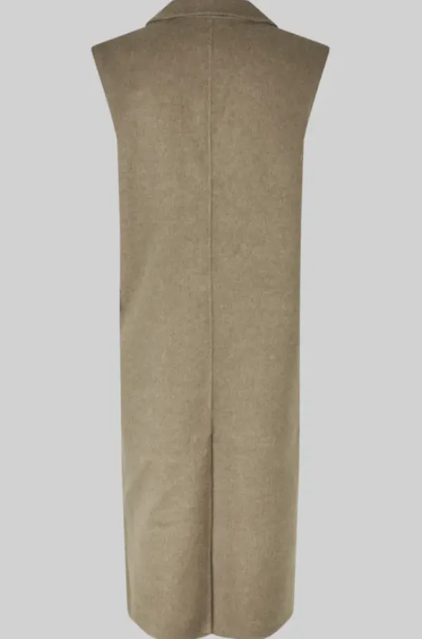 Second Femalen kevätkauden ihana uutuus: pitkä vuoriton villakangasliivi kauniissa meleeratun beigessä sävyssä. Takana halkio.
