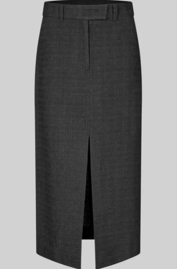 Second Female skirt with slit. Made in a thick fabric blend with slightly structured finish. Featuring a concealed zip, hook and button fastening at the front. Fitted seams at the back. Slanted pockets at the front. Belt loops at the waist. Deep slit at front. Long, slim and straight fit.