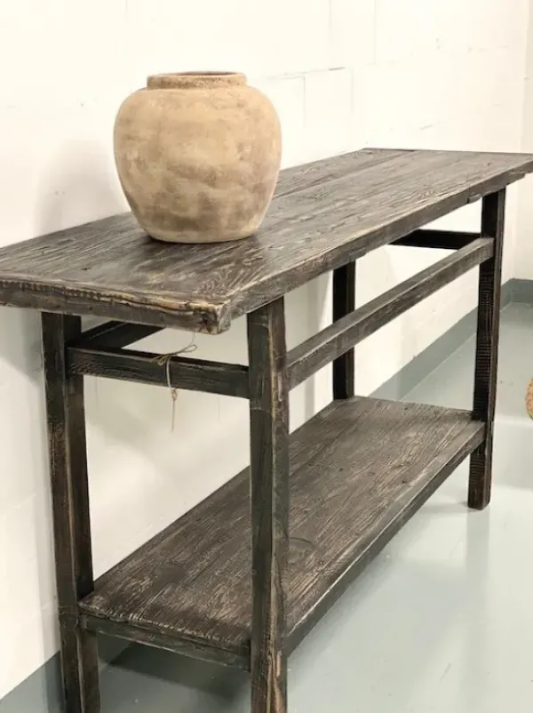 Kaunis kuluneen mustan sävyinen pitkä sivupöytä eläväisellä pinnalla. Tässä sivupöydässä on hylly, jonne voit laittaa esim. koreja, kirjoja tms. Eteiseen, keittiöön tai makuuhuoneeseen aina tarpeen ja fiiliksen mukaan. Rosoisista puuhuonekaluistamme syntyy luonnollinen ilme kotiisi!!