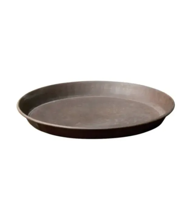 Tine K Homen sinkkinen aluslautanen kukkaruukuille. Tämä kukkalautanen on käsitelty rustiikkisen ruskeaksi.
