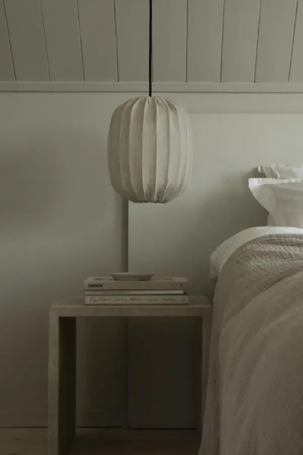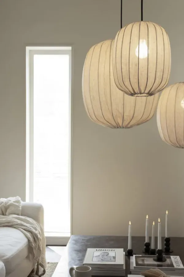 Kaunis kattovalaisin, jossa metallikehikko ja pellavakangas. Kankaan sävynä nature. Valo hohtaa kauniisti pellavakankaan läpi luoden eläväisen ilmeen. Prisma 45 sopii täydellisesti suuren keittiönpöydän yläpuolelle, olohuoneen pöydän päälle tai ryhmäksi sarjan muiden valaisimien kanssa.
